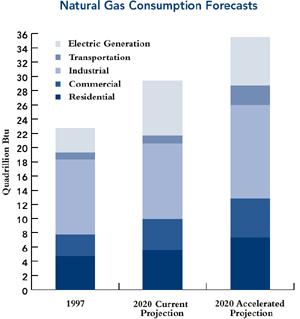 In contrast, the study's accelerated projection does assume the removal of barriers and the implementation of positive policies. Under this scenario, overall natural gas consumption is estimated to reach 35 quadrillion Btu (quads) by 2020, more than 20 percent more than what is forecast under the current projection. In 1998, 21.9 quads of natural gas were consumed in the United States.